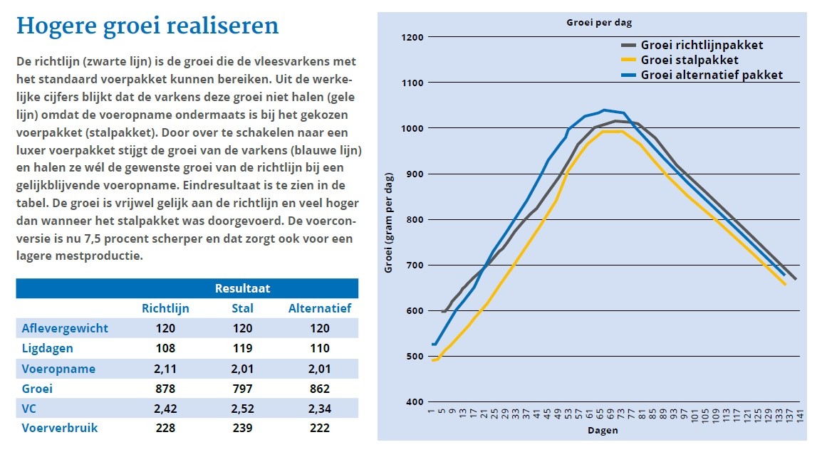 Het Vleesvarkens Informatie Model draait al anderhalf jaar op de vleesvarkensbedrijven en levert real time data over groei en voerverbruik van de vleesvarkens. Daarvoor wordt bij opleg een aantal hokken vleesvarkens gewogen en dat gebeurt daarna ook geregeld tijdens de ronde. Vanuit de voercomputer is daarnaast het voerverbruik per week bekend. “Deze real time gegevens leggen we voortdurend naast de richtlijn voor groei en voerconversie”, zegt Vinken. “We kijken of de cijfers ook kloppen met de verwachting, zoals weergegeven in de grafiek. Is dat niet zo, dan kijken we samen met de vleesvarkenshouder of er al tijdens de ronde veranderingen nodig zijn. Bijvoorbeeld langer startvoer doorvoeren als het nodig is om de groei in het begin te verhogen, of overschakelen naar een andere voerlijn om het gewenste resultaat te behalen. We kijken dus niet achteraf hoe het ging, maar sturen al tijdens de ronde bij, zodat groei en voerconversie en het rendement voor de varkenshouder optimaal zijn.” Voor een accurate vergelijking heeft Fransen Gerrits inmiddels de gewenste groei- en voerconversiecijfers van veel typen vleesvarkens in huis. Dat geldt voor dieren met een Topgis 20, TN70 of Danbred als moeder en een Piétrain, Talent of Tempo als vader. Vinken: “We kunnen dus heel exact sturen.”