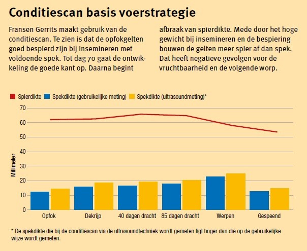 Uit onderzoek dat Fransen Gerrits samen met Provimi uitvoert, blijkt dat het niet eenvoudigweg gaat om voldoende conditie en gewicht. De opfokgelten moeten vooral genoeg spekdikte hebben. Bij het onderzoek is de spek- en spierdikte en het gewicht van 2.946 opfokgelten gemeten. De gelten met het hoogste lichaamsgewicht bij insemineren hadden in de eerste worp wel het hoogste aantal totaal geboren biggen. Maar bij zware zeugen met veel spier en weinig spek was de kans op doodgeboren biggen hoger en het aantal biggen bij spenen lager. De relatief lichtere opfokgelten waren daarmee in het voordeel. Nader onderzoek leerde dat de zwaardere meer gespierde gelten met name in de laatste maand van de eerste dracht spierverlies vertoonden. Dat verklaarde de minder goede resultaten in de eerste worp. Het spierverlies bij de meer gespierde gelten gaat in de eerste lactatie verder door, met negatieve gevolgen voor de tweede en volgende worpen en de levensduur. Het is daarom van belang dat de jonge zeugen mooi volgens ‘het boekje’ opgroeien. ‘Dat is niet zo eenvoudig want door de hoge aanleg voor vleesproductie kunnen ook de opfokgelten hard groeien’, zegt Van Haperen. ‘Ze zouden wel 1.000 gram of meer groei per dag kunnen halen. Terwijl tijdens de opfok maar 650 tot zo’n 700 gram per dag gewenst is. Rustig opgroeien is nodig omdat de opfokgelten de juiste verhouding spier en spek moeten aanleggen en het beenwerk en alle organen zich goed moeten ontwikkelen voor een lange levensduur.’
